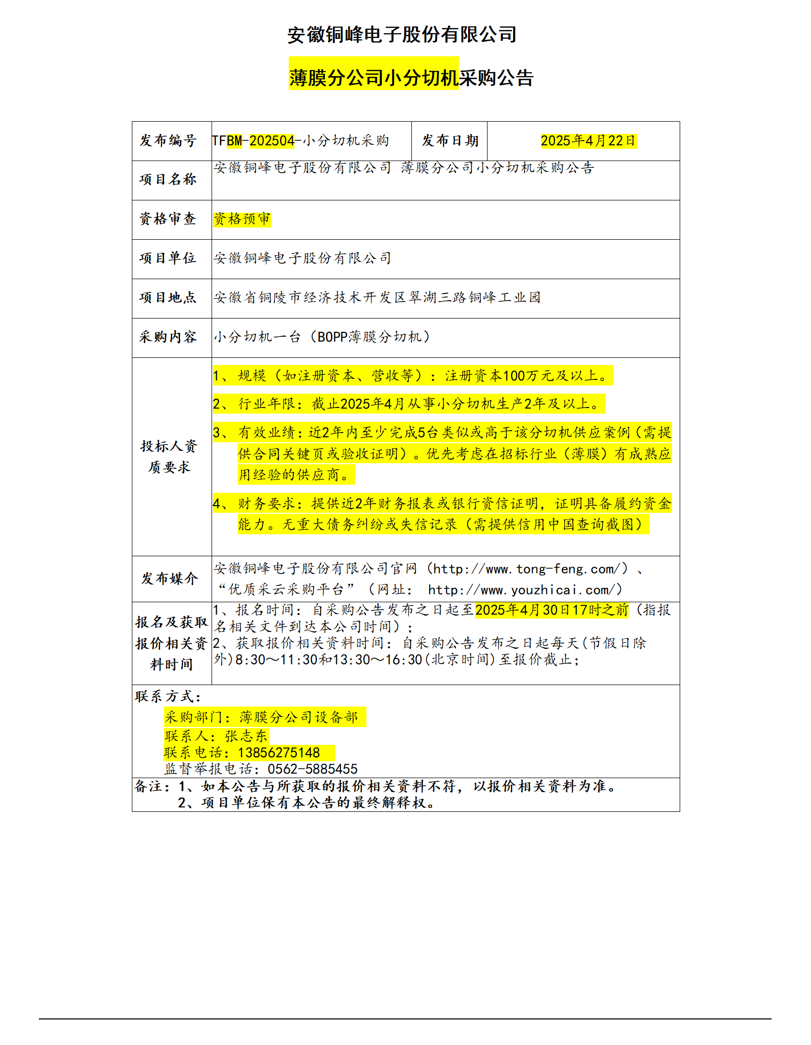 安徽銅峰電子股份有限公司—— 薄膜分公司小分切機(jī)采購公告_01