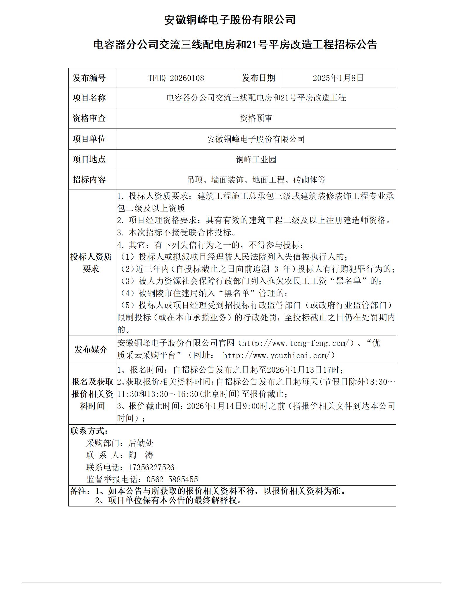 01-安徽銅峰電子股份有限公司 (電容器分公司交流三線配電房和21號平房改造工程 招標(biāo)公告)_01