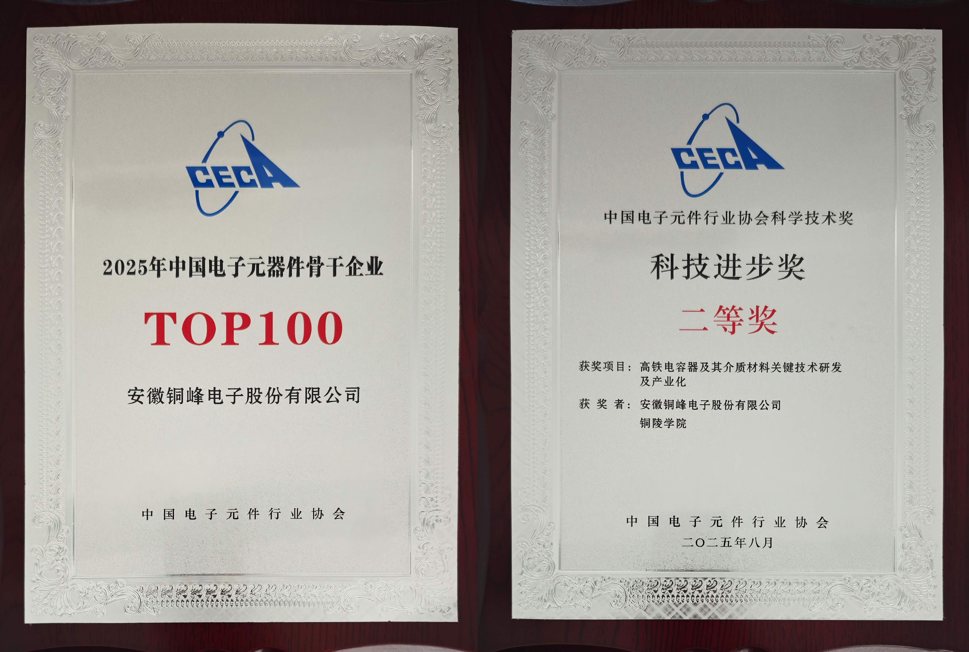 會議過程中,除舉辦主題演講、高端對話、分會平行論壇外,還舉行了2025年中國電子元器件骨干企業(yè)、2025年度(第3屆)中國電子元件行業(yè)協(xié)會科學技術獎頒獎儀式,公司連續(xù)三十余屆獲評“中國電子元器件骨干行業(yè)TOP100 ”榮譽,并榮獲中電元協(xié)科技進步二等獎。